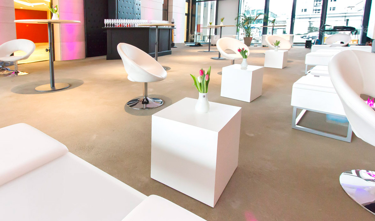 Jede Veranstaltung braucht ein Ambiente, das perfekt zum Anlass passt. Sie wünschen sich für Ihre Veranstaltung eine kuschelige Loungeatmosphäre oder eine schicke Bar? Um Ihrem privaten oder geschäftlichen Event die von Ihnen erwartete außergewöhnliche Note zu geben, statten wir die Räume für Sie gerne auch mit Leihmöbeln für höchste Ansprüche aus. Egal ob Klassiker für eine entsprechende Lounge-Atmosphäre oder stilvolle Design-Objekte, wir garantieren eine sorgfältig ausgewählte Einrichtung genau nach Ihren Vorstellungen!